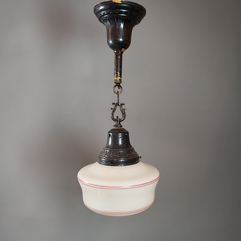 1930s–40s Black Painted Ceiling Light w/ Milk Glass Shade and Red Banding